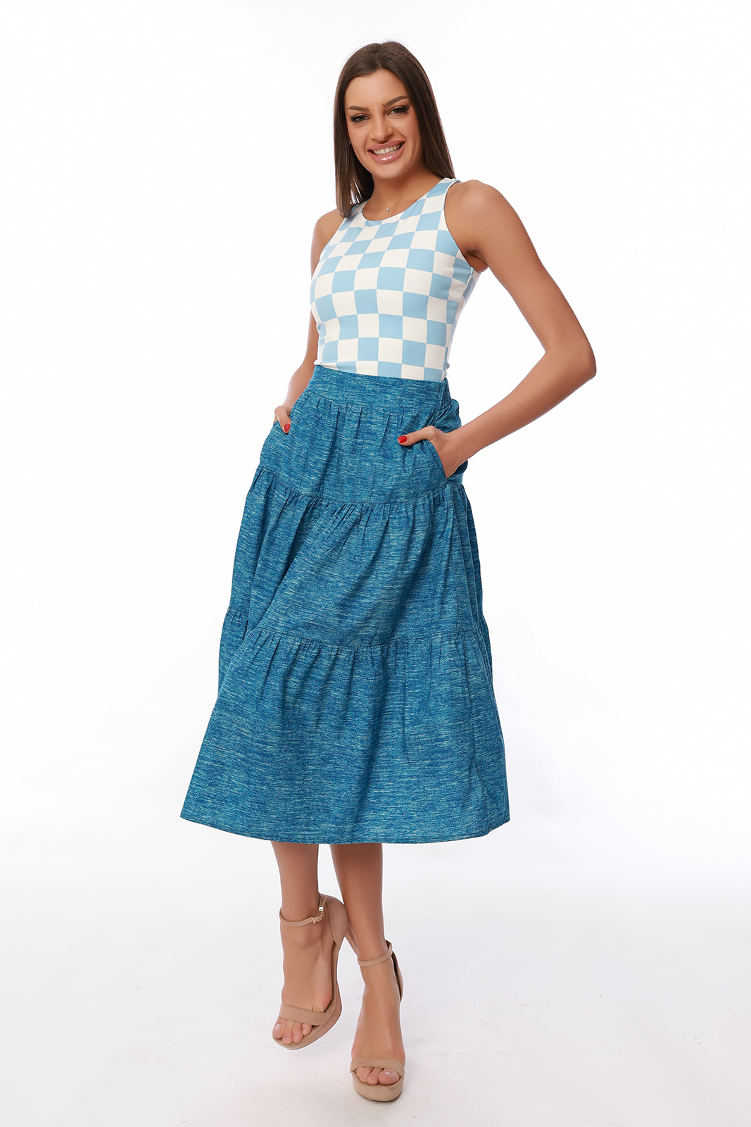 COLETTA transmite feminitate si eleganta iar banda elastica din spate asigura flexibilitate si confort. Lungimea midi si buzunarele functionale echilibreaza stilul casual si cel creativ/sofisticat.